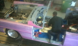 Lincvolt moves to Sid Chavers' Fine Auto Upholstery today and has left Brizio's shop for approximately 3 weeks. When Lincvolt returns to Brizio's with a complete interior, looking like a finished car, a visiting Bruce Falls will place and connect the battery pack. Instrumentation and touchscreen integration will then be completed. System tuning and road testing will follow. We are getting closer and the excitement is building.