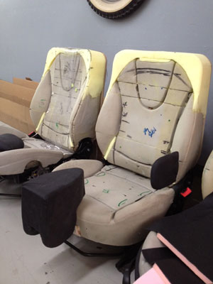 Custom seating for team member Ben Young is under construction at Sid Chavers' Fine Auto Upholstery. Ben Young is a quadriplegic who travels in a wheelchair and has accompanied the Lincvolt project on many road tests. Usually he is cradled in the arms of Dave "Snowbear" Toms, aka the passenger, but now with his new custom seating, Ben is independent. As the project's spiritual leader, Ben Young has been a guiding light over the years, showing us that anything is possible and reminding us that we just have to keep trying.