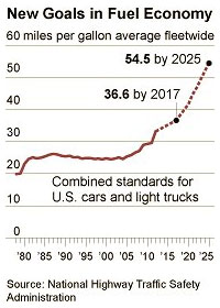Current rules for the Corporate Average Fuel Economy, or CAFE, program mandate an average of about 29 miles per gallon, with gradual increases to 35.5 m.p.g. by 2016.