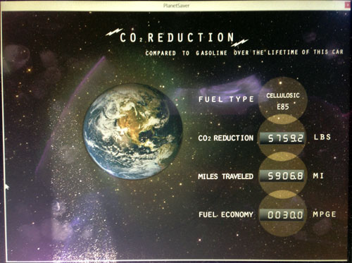 Cellulosic Ethanol has an 86% reduction in GHG emissions per gallon compared to gasoline, according to figures from the US Department of Energy and will soon enable us to save enough carbon emissions to equal the weight of Lincvolt, a 6000 LB or 3 TON 1959 Lincoln Continental converted to a series hybrid electric drive, recharged on the go by a biomass powered generator. We are now closing in on our target of saving planet Earth from 3 tons of CO2 emissions. As we drive Lincvolt around the continent, updating and comparing our car’s emissions to a new “best in class” gasoline powered vehicle of the same size and weight, we are tracking our progress with an onboard app. You can see by this recent screen shot from Lincvolt’s dashboard that we are very close to our goal.